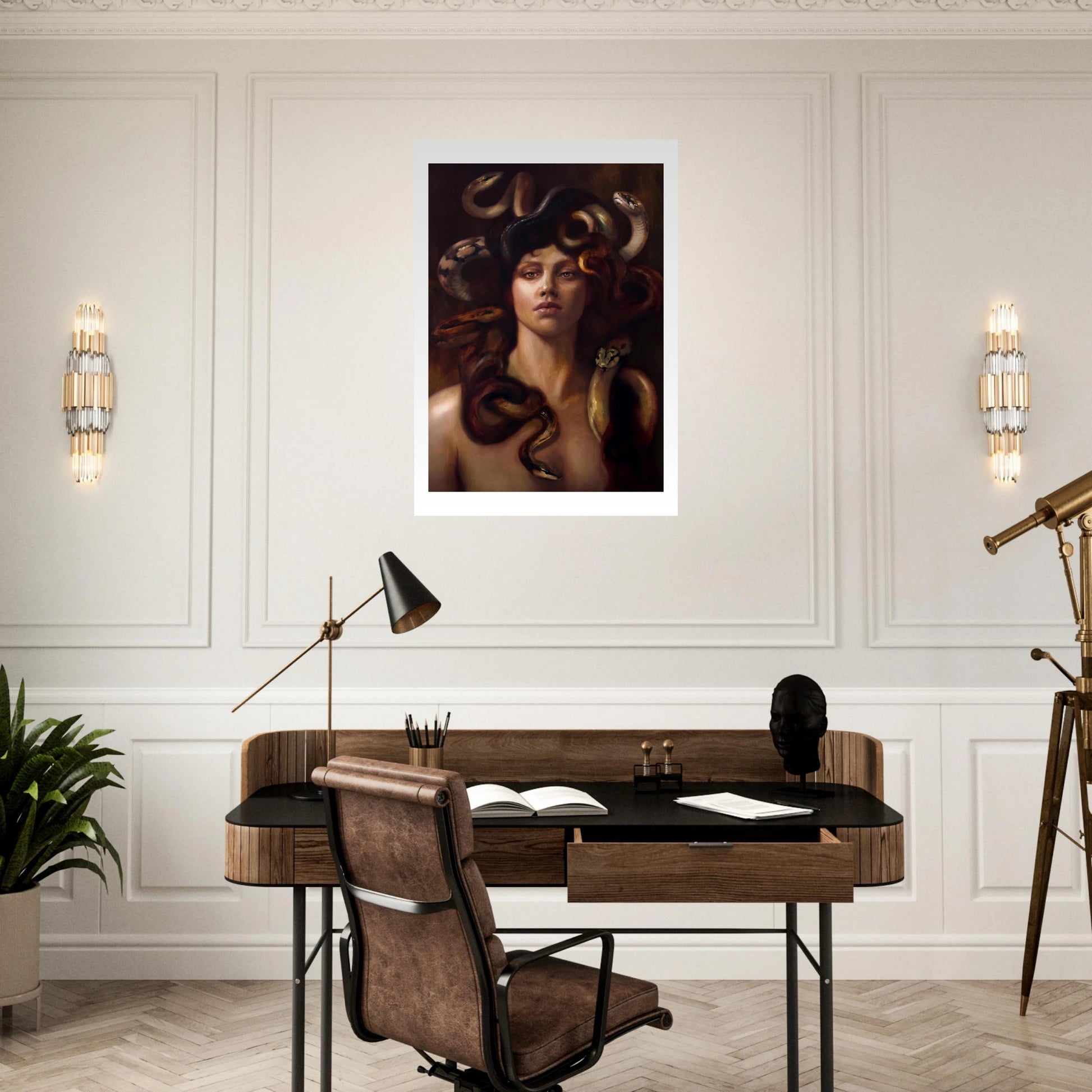 Medusa remains one of the most powerful and haunting figures in Greek mythology. Once a priestess of Athena, she was transformed into a creature whose gaze could turn men to stone. In this piece, her quiet stare carries the weight of that legend.